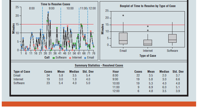 Reviewing the boxplots, we see that the box associated with the email cases is “larger” than the boxes associated with the other two types of cases. The summary statistics also show that the standard deviation of the time to resolve email cases is larger than the standard deviations of the times to resolve the other types of cases. This leads us to take a closer look at the email cases in the two new graphs. The boxplot for the email cases has a whisker that extends beyond 15 minutes and an outlier well beyond 15 minutes. The graph of the time to resolve individual cases (in the lower left position of the dashboard) shows that this is because of two calls on email cases during the 9:00 hour that took longer than the target maximum time (15 minutes) to resolve. This analysis may lead the IT call center manager to further investigate why resolution times are more variable for email cases than for Internet or software cases. Based on this analysis, the IT manager may also decide to investigate the circumstances that led to inordinately long resolution times for the two email cases that took longer than 15 minutes to resolve.