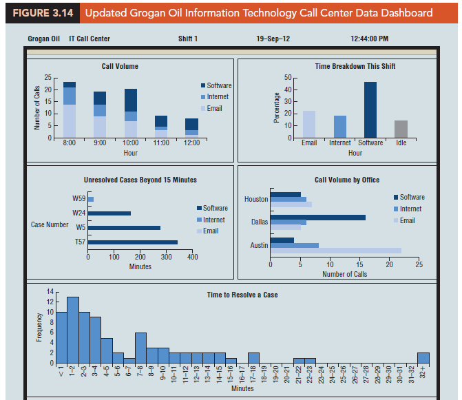 Dashboards such as the Grogan Oil data dashboard are often interactive. For instance, when a manager uses a mouse or a touch screen monitor to position the cursor over the display or point to something on the display, additional information, such as the time to resolve the problem, the time the call was received, and the individual and/or the location that reported the problem, may appear. Clicking on the individual item may also take the user to a new level of analysis at the individual case level.