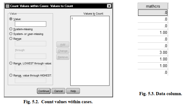 - Type 1 in the Value box and click on Add. This sets up the computer to count how many 1s (or courses taken) each participant had. The window will now look like Fig. 5.2.