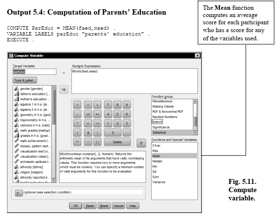 We have decided to combine father’s and mother’s education scores because, as we will find out later, they are highly correlated. Thus, for some purposes, it is better to treat them as one variable. We also want to demonstrate the use of the Mean function, which is a type of Compute function that we used to create the pleasure scale. Note that, in this problem, we will use the original father’s and mother’s education variables (not the revised ones). This provides us with a variable that has more range.