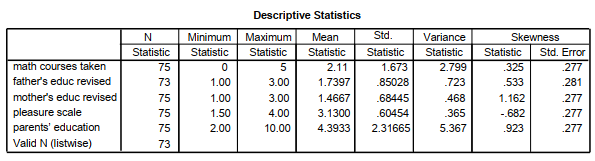 Using Chapter 4 (Problem 4.1) as a guide, compute the descriptive statistics (Minimum, Maximum, Mean, Standard Deviation, Variance, and Skewness) for the new variables math courses taken, father’s educ revised, mother’s educ revised, pleasure scale, and parents’ education.