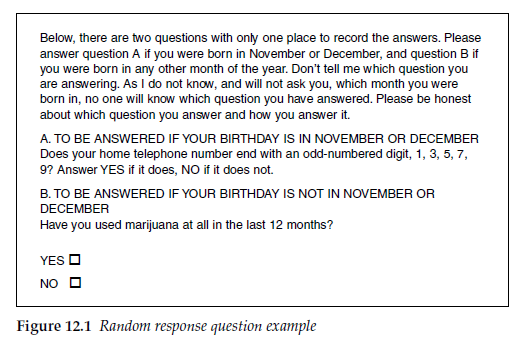 To achieve this, two questions with the same set of response codes are presented for self-completion. One of these is the sensitive or threatening question, and the other is the non-threatening and innocuous one. Respondents are allocated to answer one of these questions in a random way, the outcome of which is unknown to the interviewer. This can be by having balls of two different colours in a bag and asking the respondent to draw one out without showing it to the interviewer, or tossing a coin out of sight of the interviewer. However, this can be a cumbersome process in most interview situations.