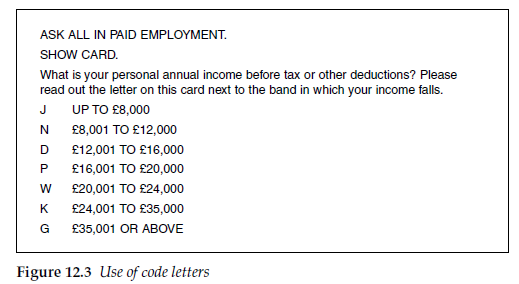 So that respondents do not have to articulate the response to the interviewer, code letters can be used against each of the prompted response categories and the respondent asked to read out the appropriate code letter. Respondents therefore do not have to read aloud the answer, which helps them to feel that a degree of confidentiality is being maintained. The interviewer of course knows to which response category each code applies, but respondent and interviewer do not have to share the information overtly (see Figure 12.3).
