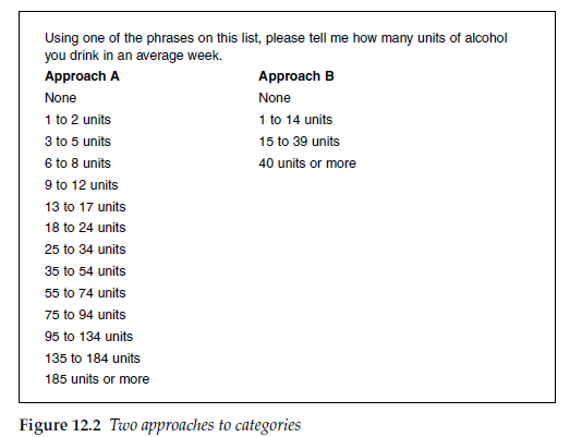 In a similar way, extended responses on prompt material can suggest that extreme behaviour is not unusual and encourage honest responses. For example, when asking the amount of alcohol that people drink, the researcher can use prompts with categories that go well beyond normal behaviour, so that categories of mildly heavy drinkers appear mid-way on the list. This helps heavier drinkers to feel that their consumption might be of a more normal level than it actually is, and they may be more likely to be honest and not under-report. Care needs to be taken not to make light drinkers feel inadequate and so feel forced to over-report their weight of drinking. Having relatively small gradations at the lighter end of the scale, thus helping the lighter drinkers to see that they have more options, can help this (see Figure 12.2).