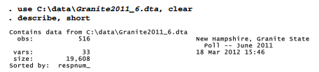 Hampshire’s presidential primary campaigns. Dataset Granite_2011_6.dta contains questions from a Granite State Poll of 516 people, conducted in June 2011.