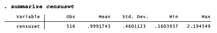 To compensate for minor bias in sampling, survey researches routinely calculate probability weights. Some weights are calculated from comparisons between sample and population characteristics, such as gender in the example above. Others are based on features of the sampling design. For the Granite State Poll, researchers define a variable named censuswt that combines adjustments for household size, number of telephone lines, gender and region within the state. censuswt values in the June 2011 poll have a mean of 1 but range from .16 (observations given low weights to compensate for over-representation) to 2.19 (high weights to compensate for under-representation).