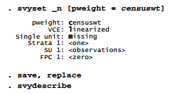 A svyset command declares the survey structure of the data, with probability weights given by censuswt. Saving the data then saves this information, although survey weights will be used in any particular analysis only if we specifically ask for them. Otherwise the data are unchanged.