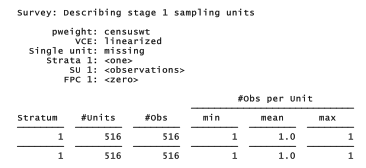 Type help survey for a list of analytical possibilities. The svyset command also can declare more information than just the probability weights used in the example above. svyset options allow for complex designs including stratified and multistage cluster sampling, finite population corrections, alternative methods of variance estimation, and poststratification. Type help svyset to see the syntax and a complete list of options. The Survey Data Reference Manual gives more examples and technical details.