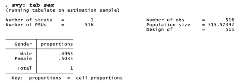 Once data have been svyset, commands with the prefix svy: will perform calculations using the survey weight information. After weighting the gender balance is closer to what we expect in the population.