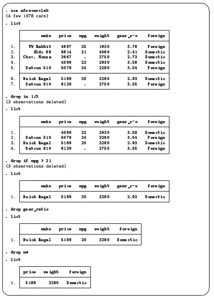 - If you want to drop observations, use drop with an if or an in qualifier or both.