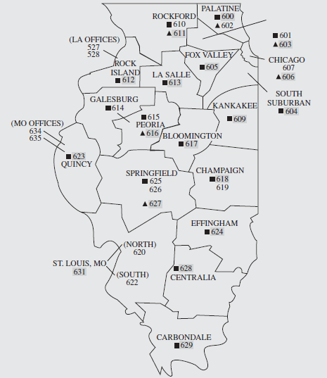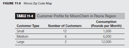 John decided to take a careful look at his distribution operations. He focused on Illinois, which was supplied from the Chicago distribution center. He broke up Illinois into a collection of zip codes that were contiguous, as shown in Figure 11-9. He restricted attention to the Peoria region, which was classified as zip code 615. A careful study of the Peoria region revealed two large customers, six medium-sized customers, and twelve small customers. The annual consumption at each type of customer was as shown in Table 11-4. Golden charged $400 for each shipment from Chicago to Peoria, and MoonChem’s policy was to send a full truckload to each customer as needed.