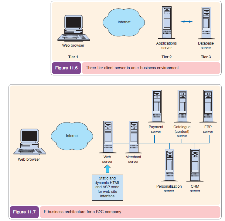 Although the three-tier model of an e-business system suggests a relatively simple architectural design, the reality is more complex. Different servers are needed which combine applications logic and database storage for different requirements. These may be physically separate servers or may be combined. Figure 11.7 shows a typical e-business architecture.