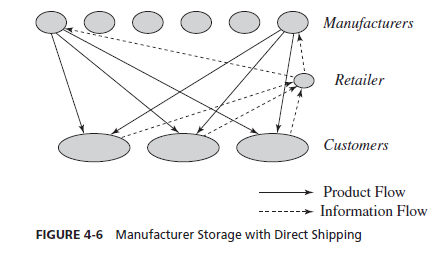 In this option, product is shipped directly from the manufacturer to the end customer, bypassing the retailer (who takes the order and initiates the delivery request). This option is also referred to as drop-shipping. The retailer carries no inventory. Information flows from the customer, via the retailer, to the manufacturer, and product is shipped directly from the manufacturer to customers, as shown in Figure 4-6. Online retailers such as eBags and Nordstrom.com use drop-shipping to deliver goods to the end consumer. eBags holds few bags in inventory. Nordstrom carries some products in inventory and uses the drop-ship model for slow-moving footwear. W.W. Grainger also uses drop-shipping to deliver slow-moving items to customers.