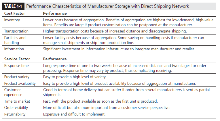 The performance characteristics of drop-shipping along various dimensions are summarized in Table 4-1.