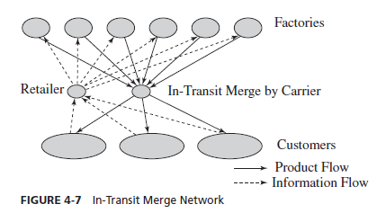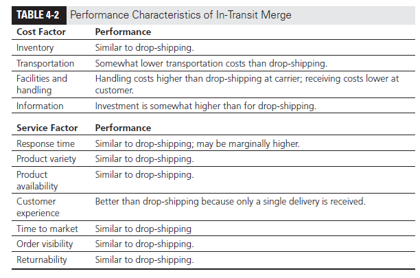 Although an increase in coordination is required, in-transit merge decreases transportation costs relative to drop-shipping by aggregating the final delivery.