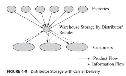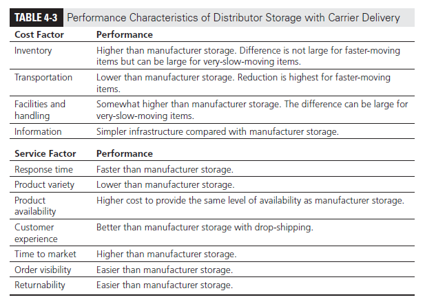The performance of distributor storage with carrier delivery is summarized in Table 4-3. Distributor storage with carrier delivery is well suited for slow- to fast-moving items. Distributor storage also makes sense when customers want delivery faster than is offered by manufacturer storage but do not need delivery immediately. Distributor storage can handle somewhat lower variety than manufacturer storage but can handle a much higher level of variety than a chain of retail stores.