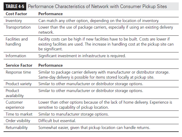 The performance characteristics of manufacturer or distributor storage with consumer pickup sites are summarized in Table 4-5. The main advantages of a network with consumer pickup sites are that it can lower the delivery cost and expand the set of products sold and customers served online. The major hurdle is the increased handling cost and complexity at the pickup site. Such a network is likely to be most effective if existing retail locations are used as pickup sites, because this type of network improves the economies from existing infrastructure. In particular, such a network can be effective for firms like Seven-Eleven Japan, Walmart, and W.W. Grainger, which have both a network of stores and an online business. Unfortunately, such retail sites are typically designed to allow the customer to do the picking and need to develop the capability of picking a customer-specific order.