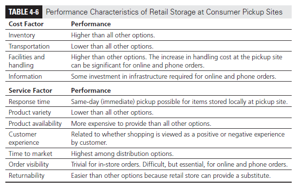 The performance characteristics of a network with customer pickup sites and local retail storage are summarized in Table 4-6. The main advantage of a network with retail storage is that it can lower delivery costs and provide a faster response than other networks. The major disadvantage is the increased inventory and facility costs. Such a network is best suited for fast-moving items or items for which customers value rapid response.