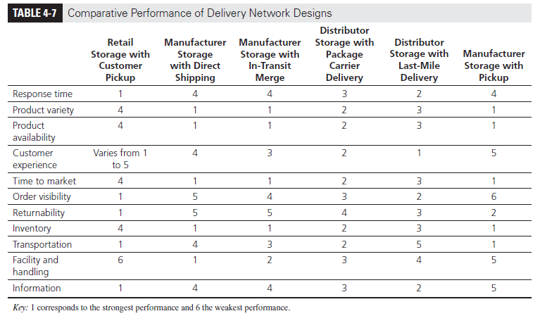 A network designer needs to consider product characteristics as well as network requirements when deciding on the appropriate delivery network. The various networks considered earlier have different strengths and weaknesses. In Table 4-7, the various delivery networks are ranked relative to one another along different performance dimensions. A ranking of 1 indicates the best performance along a given dimension; as the relative performance worsens, the ranking number increases.