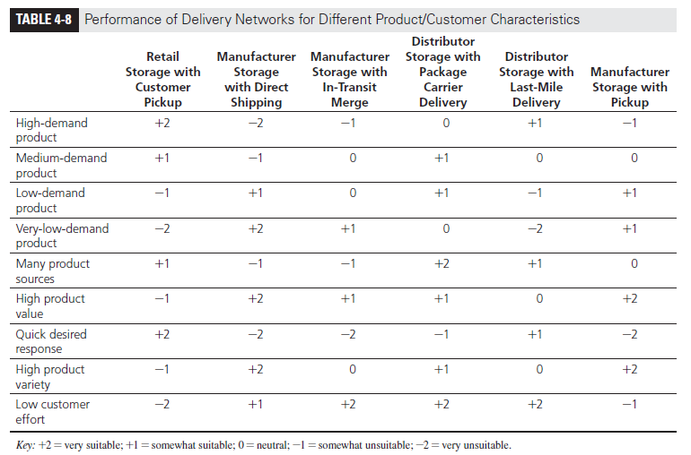Only niche companies end up using a single distribution network. Most companies are best served by a combination of delivery networks. The combination used depends on product characteristics and the strategic position that the firm is targeting. The suitability of different delivery designs (from a supply chain perspective) in various situations is shown in Table 4-8.