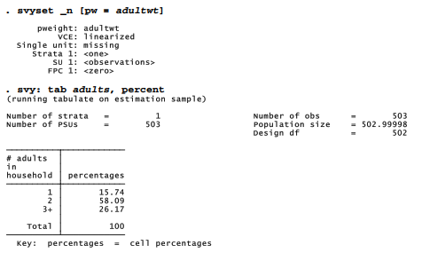 Probability weights are proportional to the inverse of the probability of selection. For our example, the conditional probability of selecting a particular person from a one-adult household (given that we phoned there) equals one. The probability of selecting a person from a two- person household equals 1/2, and from a three-person household 1/3. If we used the inverse of these probabilities, 1, 2 and 3, as weights then our sample would contain 940 pseudo-people — giving us the correct proportions, but leading to incorrect totals and other confusion. To maintain the true sample size, we can multiply these inverse probabilities by the ratio of real people to pseudo-people, 503/940. This step creates a new variable named adultwt, which contains the probability weights to adjust for a known sampling bias, while preserving the original sample size. The weights are .535 (one-adult household), 1.070 (two adults) or 1.605 (three or more); missing values get a neutral weight of 1. The ratio of these weights remains 1:2:3.