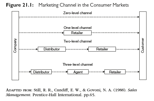 For example, many agents procure orders of medicines from the hospitals and also help in the delivery of these products by mediating between the distributor and the retailer. Figure 21.1 shows the different marketing channel levels in consumer markets.