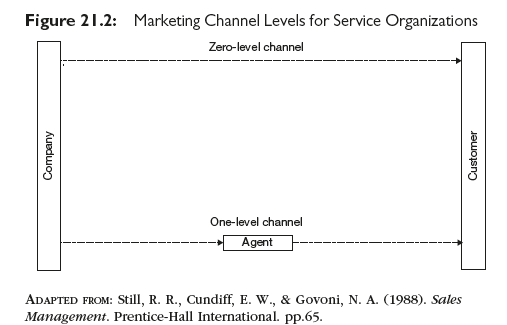 Service organizations go for short channels because of intangibility and perishability of products. In most cases, the service organizations follow a zero-level channel as these companies sell the products directly to the customers whereas few service organizations like insurance, travel, real estate do need an intermediary, often an agent, who mediates between the company and the customer and helps to complete the transaction. Figure 21.2 shows the different marketing channel levels for service organizations.