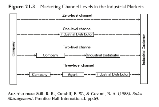 Companies marketing industrial products usually prefer shorter marketing channels than consumer products companies due to geographical concentrations and relatively few customers. In a zero-level channel, the company sells the products directly to the industrial customers. Most of the companies in industrial selling follow the zero-level channel. In a one-level channel, the company sell the products to customers through the industrial distributors. Most of the companies in the industrial markets follow the one-level channel structure. There are two channel intermediaries between the company and the customer in the two-level channel structure. These two intermediaries are the company’s representative and the industrial distributor. In the three-level channel structure, an agent mediates between the industrial distributor and the company’s representative. For example, many agents procure export orders by mediating between the distributor and the company representative. Figure 21.3 shows the different marketing channel levels in industrial markets.