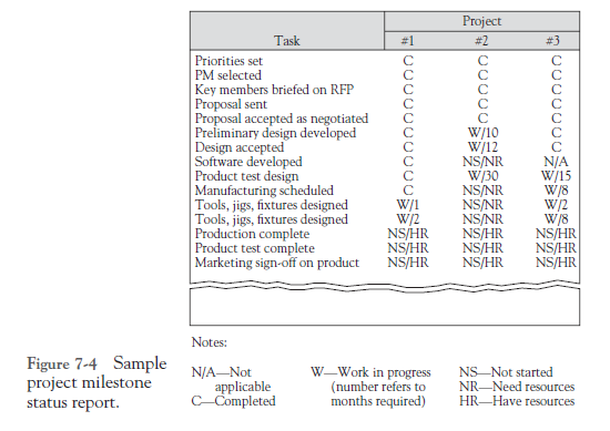 An example of a status report used by the agricultural products division of a large chemical company for go/no-go control is illustrated in Figure 7-4. As can be seen, some of the tasks are completed, some are in progress, and some have not yet started. Details from the PM or additional reports about those tasks completed and in progress are used to make the go/no-go decisions.