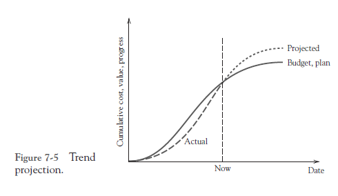 We have already described some of the tools that can help the PM in designing and applying the control system: variance analysis, trend projections, and earned value analysis. With trend projection, for instance, the PM can plot a budget, plan, or growth curve as shown in Figure 7-5 and then, as actual values come in with project progress, plot these as a dashed line on the same chart. Using the dashed line, the PM can forecast on a continuing basis what the projected completion will be. Based on the projection, the PM can decide if there is a problem, what alternatives exist for control, what they will cost and require, and what they will achieve.