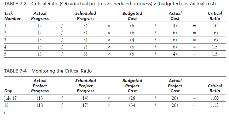 Another useful tool for a PM is the critical ratio. A critical ratio indicates to a manager when a task or process is becoming unacceptable, typically when the ratio drops below 1. By tracking the ratio, the manager can anticipate when a problem may be brewing. The calculation of the critical ratio for project tasks is the product of a schedule ratio and a cost ratio. The schedule ratio is actual progress divided by scheduled progress, as measured by some common standard such as earned value: EV/PV. Clearly, ratios greater than one are desirable. The cost ratio is budgeted cost divided by actual cost, or if earned value data are available, EV/AC. Again, values greater than one are most desirable. Taking the product of these two ratios thus gives us an overall measure that includes performance, cost, and schedule.