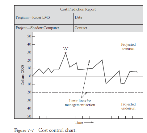Dealing with such differences is the purpose of another tool, the control chart. Any measure—the volume of raw material being used, the cost of contract labor in the project, the hours of computer time—can be plotted and tracked on a control chart such as that shown in Figure 7-7. As illustrated, control limits for intervention can be set by the PM and shown on the chart, so that when a measure exceeds one of these limits, action is instigated.