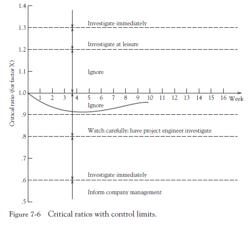 Beyond evaluating each of the activities of a project, a critical ratio for the project as a whole can be calculated as well, as illustrated in Table 7-4. Here, the project is assumed to consist of the five tasks in Table 7-3 and the values of each element of the critical ratio are summed on a daily basis with the critical ratio calculated for each day. This ratio can then be itself tracked in a table (see Table 7-4 where the first day is from Table 7-3) and plotted on a control chart. The PM can also set some “control limits” for the critical ratio so that if they are exceeded on the upside or downside, an investigation is in order, as shown in Figure 7-6. Different tasks, of course, may warrant different control limits. Further, the upside limits may be different, probably larger, than the downside (problem) limits.