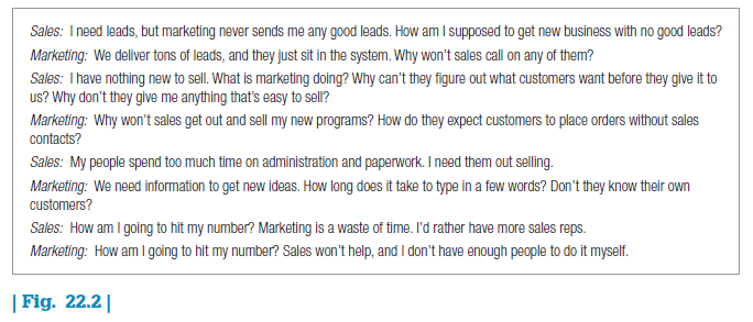 Too often marketing and sales are in conflict: the sales force complains marketing isn’t generating enough leads, and marketers complain the sales force isn’t converting them (see Figure 22.2). Improved collaboration and com­munication between these two can increase revenues and profits.32