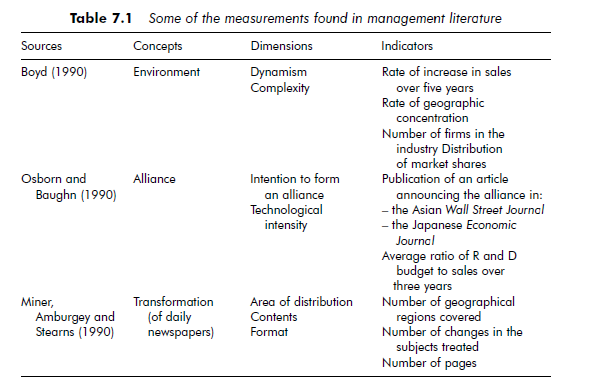 Finding measures When researchers begin in the theoretical realm, they have access to a body of work with differing levels of relevance to their own field. Published articles, doctorate theses and other works can be used as a basis from which to formulate conceptual definitions or look for available measurements. Table 7.1 illustrates several measurements.