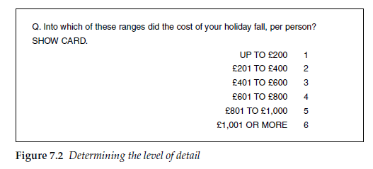 In Figure 7.2, the questionnaire writer has determined that bands of £200 are sufficiently accurate to meet the demands of the study. Bands of £50 would have given the researcher greater accuracy in calculating the average cost of a holiday and in making comparisons between sub-groups, but might have been difficult for respondents to recall accurately. This could have led to an increase in the proportion of ‘Don’t know’ responses. In this example the response categories are exclusive. If someone had paid exactly £400, it is clear where the answer should be coded.