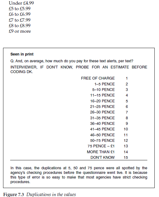Wherever possible, values should be recorded as absolute numbers (but beware of duplication, as illustrated in Figure 7.3). However, if values are to be recorded in ranges, the ranges should usually be constructed such that the most popular values occur in the middle of the ranges. For example, if the question is ‘How much did you pay for the paperback novel that you are currently reading?’, we know that most answers, if accurately given, will be £x.99. However, it would not be unusual to see the following ranges given for this question: