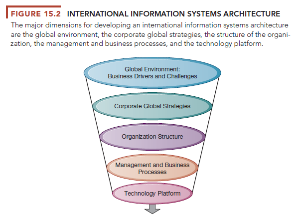 This chapter describes how to go about building an international i nformation systems architecture suitable for your international strategy. An international information systems architecture consists of the basic information systems required by organizations to coordinate worldwide trade and other activities. Figure 15.2 illustrates the reasoning we follow throughout the chapter and depicts the major dimensions of an international information systems architectue.