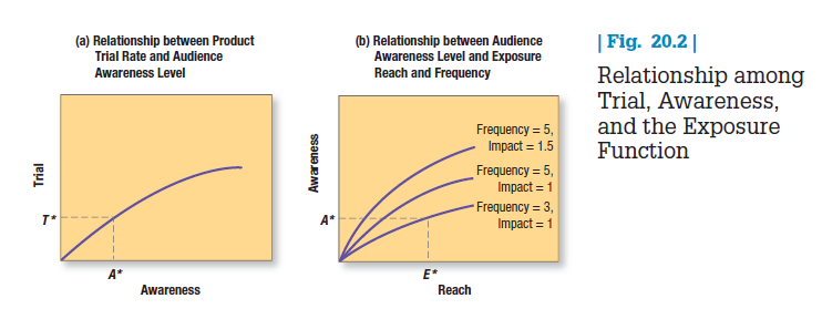 REACH, FREQUENCY, AND IMPACT Media selection is finding the most cost-effective media to deliver the desired number and type of exposures to the target audience. What do we mean by the desired number of exposures? The advertiser seeks a specified advertising objective and response from the target audience—for example, a target level of product trial. This level depends on, among other things, level of brand awareness. Suppose the rate of product trial increases at a diminishing rate with the level of audience awareness, as shown in Figure 20.2(a). If the advertiser seeks a product trial rate of T *, it will be necessary to achieve a brand awareness level of A*.