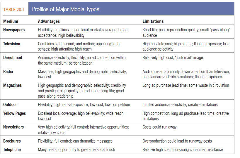 CHOOSING AMONG MAjOR MEDiA TYPES The media planner must know the capacity of the major advertising media types to deliver reach, frequency, and impact. The major advertising media along with their costs, advantages, and limitations are profiled in Table 20.1. Media planners make their choices by considering factors such as target audience media habits, product characteristics, message requirements, and cost.