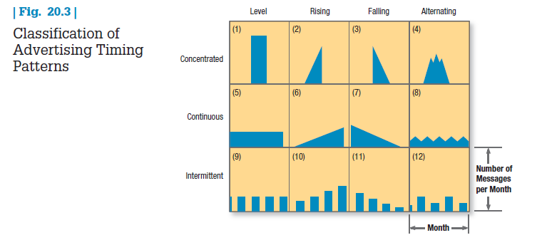 The microscheduling decision calls for allocating advertising expenditures within a short period to obtain maximum impact. Suppose the firm decides to buy 30 radio spots in September. The left side of Figure 20.3 shows that advertising messages for the month can be concentrated (“burst” advertising), dispersed continuously throughout the month, or dispersed intermittently. The top side shows they can be beamed with a level, rising, falling, or alternating frequency.