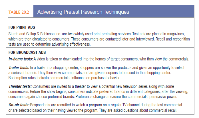 COMMUNICATION-EFFECT RESEARCH Communication-effect research, called copy testing, seeks to determine whether an ad is communicating effectively. Marketers should perform this test both before an ad is put into media and after it is printed or broadcast. Table 20.2 describes some specific advertising pretest research techniques.
