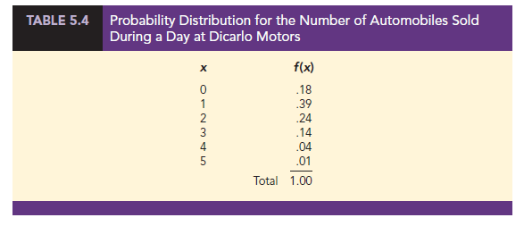 A primary advantage of defining a random variable and its probability distribution is that once the probability distribution is known, it is relatively easy to determine the probability of a variety of events that may be of interest to a decision maker. For example, using the probability distribution for DiCarlo Motors as shown in Table 5.4, we see that the most probable number of automobiles sold during a day is 1 with a probability of f(1) = .39. In addition, there is an f(3) + f(4) + f(5) = .14 + .04 + .01 = .19 probability of selling 3 or more automobiles during a day. These probabilities, plus others the decision maker may ask about, provide information that can help the decision maker understand the process of selling automobiles at DiCarlo Motors.