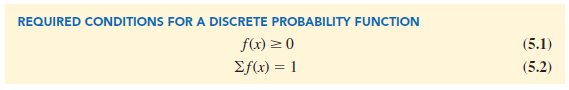 Table 5.4 shows that the probabilities for the random variable x satisfy equation (5.1); f(x) is greater than or equal to 0 for all values of x. In addition, because the probabilities sum to 1, equation (5.2) is satisfied. Thus, the DiCarlo Motors probability function is a valid discrete probability function.