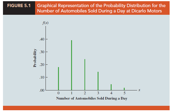 We can also show the DiCarlo Motors probability distribution graphically. In Figure 5.1 the values of the random variable x for DiCarlo Motors are shown on the horizontal axis and the probability associated with these values is shown on the vertical axis.