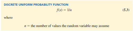 In addition to the probability distributions shown in tables, a formula that gives the probability function, f(x), for every value of x is often used to describe probability distributions. The simplest example of a discrete probability distribution given by a formula is the discrete uniform probability distribution. Its probability function is defined by equation (5.3).