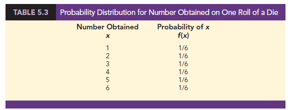 The classical method of assigning probabilities to values of a random variable is applicable when the experimental outcomes generate values of the random variable that are equally likely. For instance, consider the experiment of rolling a die and observing the number on the upward face. It must be one of the numbers 1, 2, 3, 4, 5, or 6 and each of these outcomes is equally likely. Thus, if we let x = number obtained on one roll of a die and f(x) = the probability of x, the probability distribution of x is given in Table 5.3.