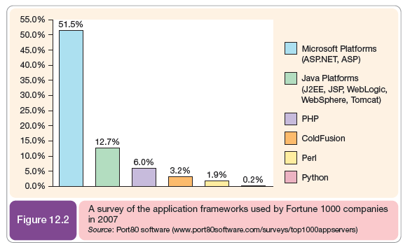 A technical discussion of the issues involved with selection of application frameworks and servers is outside the scope of this text. Essentially all of the solutions above have been successfully used to develop enterprise web services and what is most important to successful project delivery is finding the right level of skills for implementation and a project methodology or development process which is effective. The open-source alternatives have lower costs associated, but there may be difficulty in obtaining the right in-house or third-party resources to create applications of some of the less widely used frameworks and servers. This is indicated by Figure 12.2 which shows a survey of the application frameworks used by Fortune 1000 companies in 2007.