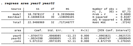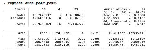 After centering, differences will be most noticeable in the centered variable’s coefficient and standard error. To see this, we regress sea ice area on year0 and year02. The R2 and overall F test are exactly as they were in the regression of area on uncentered year and year2. Predicted