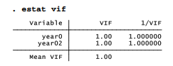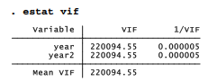 These VIF values indicate serious collinearity. Because there are only two predictors, in this instance we can confirm that observation just by looking at their correlations. year and year2 correlate almost perfectly.